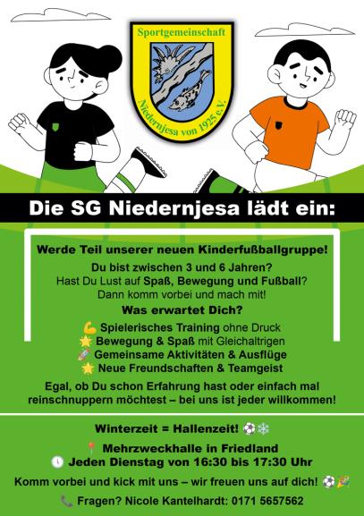 Die SG Niedernjesa bietet ab sofort eine neue Fußballgruppe für Kinder im Alter von 3 bis 6 Jahren an.