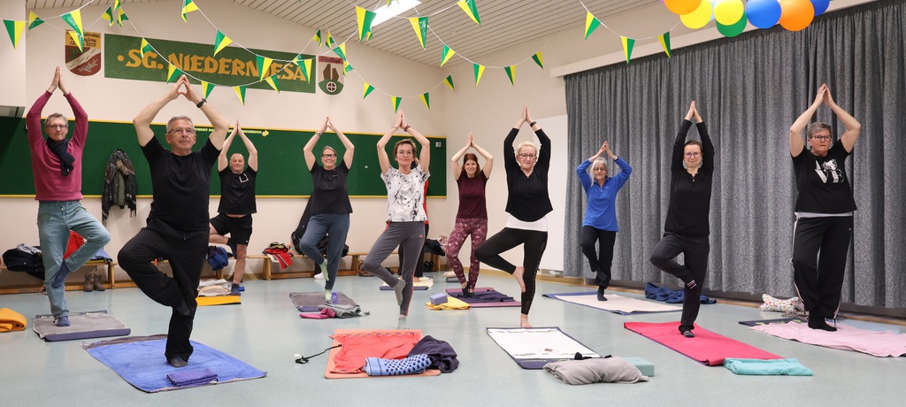 Während der Sanierung des Sporthauses fanden die Yogastunden vorübergehend in der St. Laurentius Kirche Niedernjesa sowie in der Sporthalle Groß Schneen statt. Inzwischen treffen sich rund 15 aktive Yogis und Yoginis regelmäßig montags um 18:30 Uhr im Sporthaus. In ruhiger Atmosphäre üben wir Balance, Körperkoordination und verbessern unsere Beweglichkeit durch verschiedene Yogapositionen.